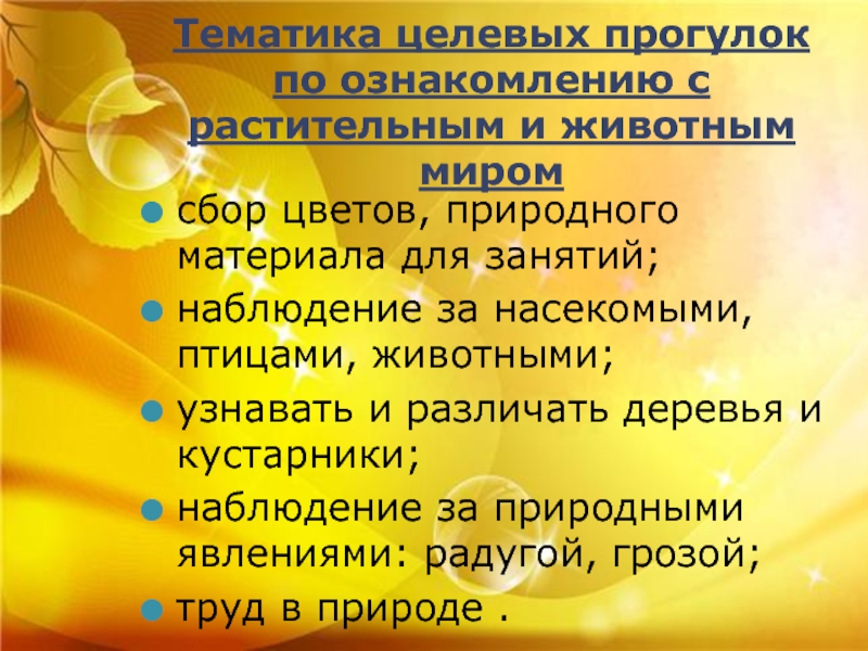 Слайд 10Тематика целевых прогулок по ознакомлению с растительным и животным миром
