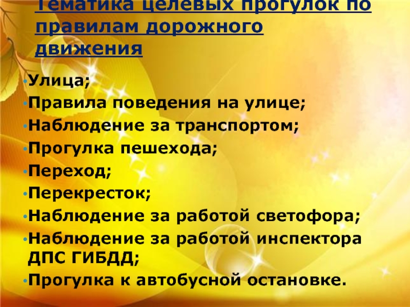 Слайд 9Тематика целевых прогулок по правилам дорожного движения