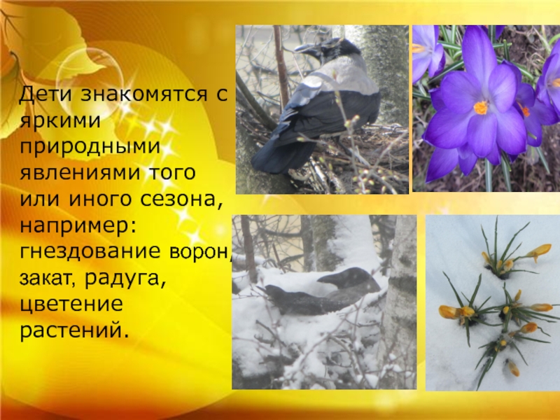 Слайд 5Дети знакомятся с яркими природными явлениями того или иного сезона,