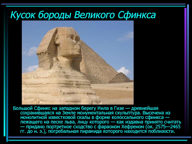 монолитной известковой скалы в форме колоссального сфинкса — лежащего на песке льва, лицу которого — как издавна принято считать — придано портретное сходство с фараоном Хефреном (ок. 2575—2465 гг. до н. э.), погребальная пирамида которого находится поблизости.