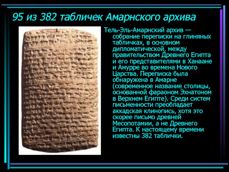 и его представителями в Ханаане и Амурре во времена Нового Царства. Переписка была обнаружена в Амарне (современное название столицы, основанной фараоном Эхнатоном в Верхнем Египте). Среди систем письменности преобладает аккадская клинопись, хотя это скорее письмо древней Месопотамии, а не Древнего Египта. К настоящему времени известны 382 таблички.