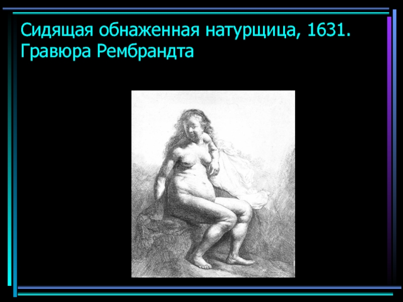 Слайд 39Сидящая обнаженная натурщица, 1631. Гравюра Рембрандта