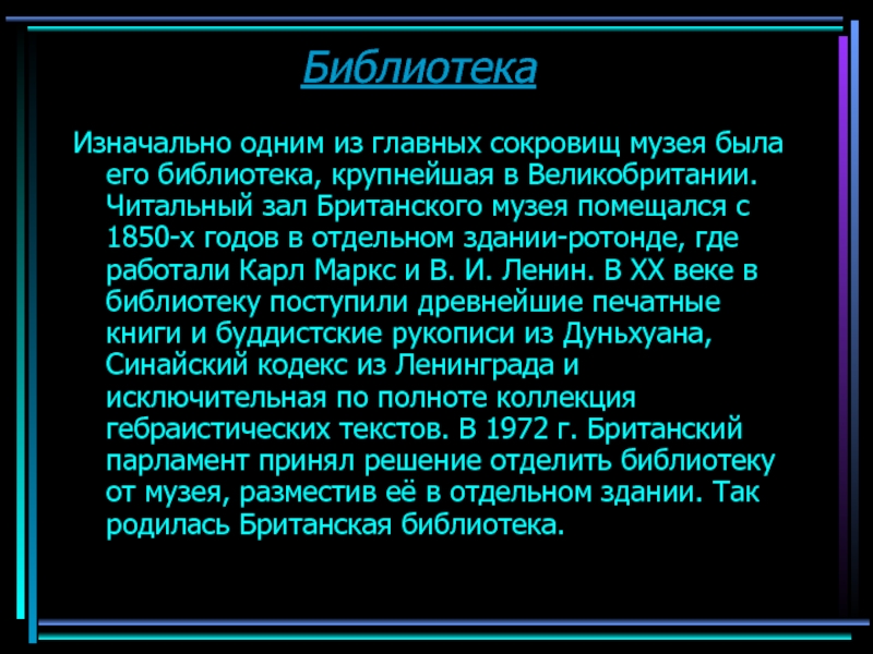 в отдельном здании-ротонде, где работали Карл Маркс и В. И. Ленин. В XX веке в библиотеку поступили древнейшие печатные книги и буддистские рукописи из Дуньхуана, Синайский кодекс из Ленинграда и исключительная по полноте коллекция гебраистических текстов. В 1972 г. Британский парламент принял решение отделить библиотеку от музея, разместив её в отдельном здании. Так родилась Британская библиотека.