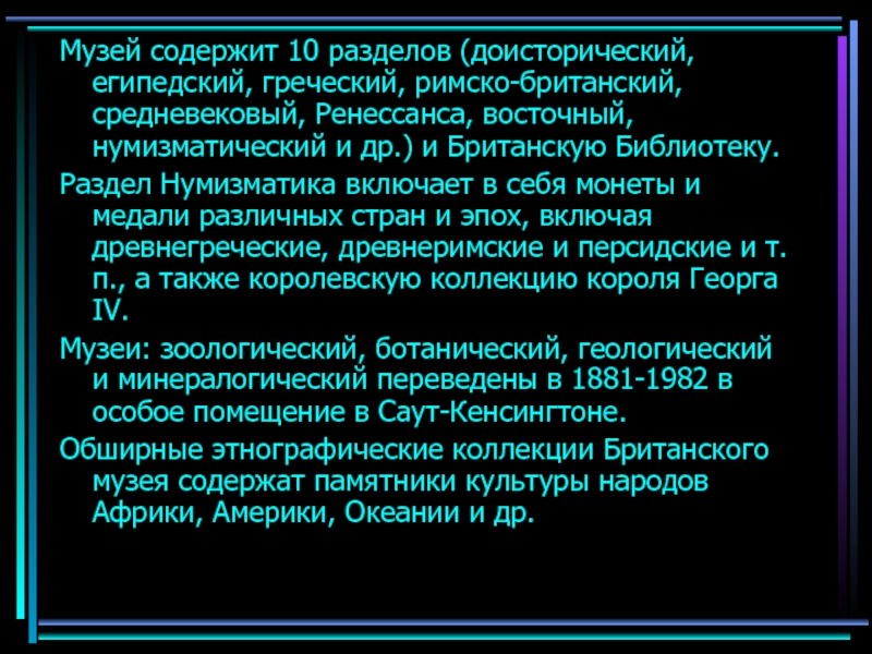 Слайд 3Музей содержит 10 разделов (доисторический, египедский, греческий, римско-британский, средневековый, Ренессанса,