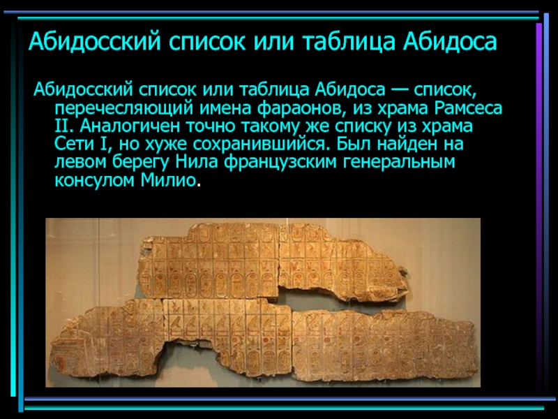 такому же списку из храма Сети I, но хуже сохранившийся. Был найден на левом берегу Нила французским генеральным консулом Милио.