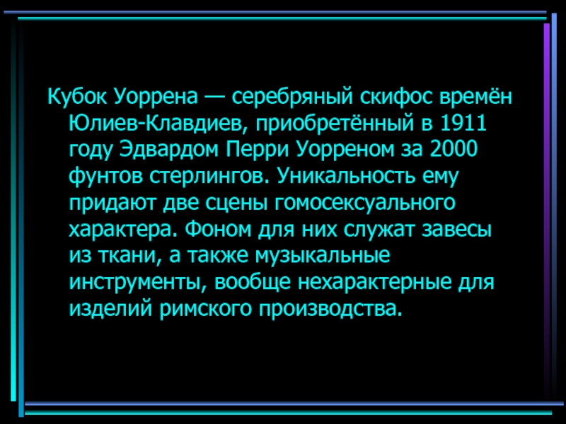 Слайд 27Кубок Уоррена — серебряный скифос времён Юлиев-Клавдиев, приобретённый в 1911