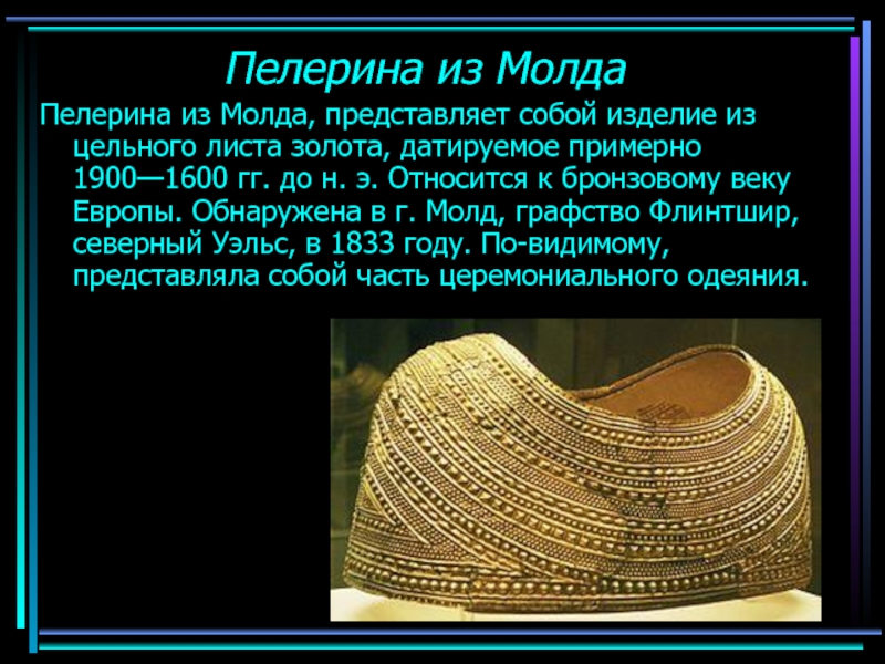 к бронзовому веку Европы. Обнаружена в г. Молд, графство Флинтшир, северный Уэльс, в 1833 году. По-видимому, представляла собой часть церемониального одеяния.