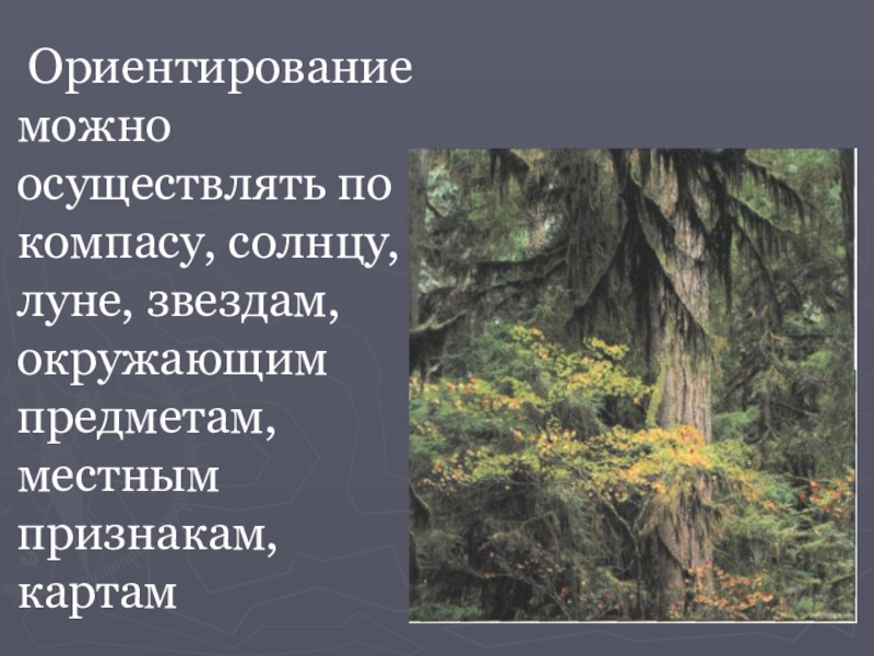 Слайд 4 Ориентирование можно осуществлять по компасу, солнцу, луне, звездам, окружающим предметам,