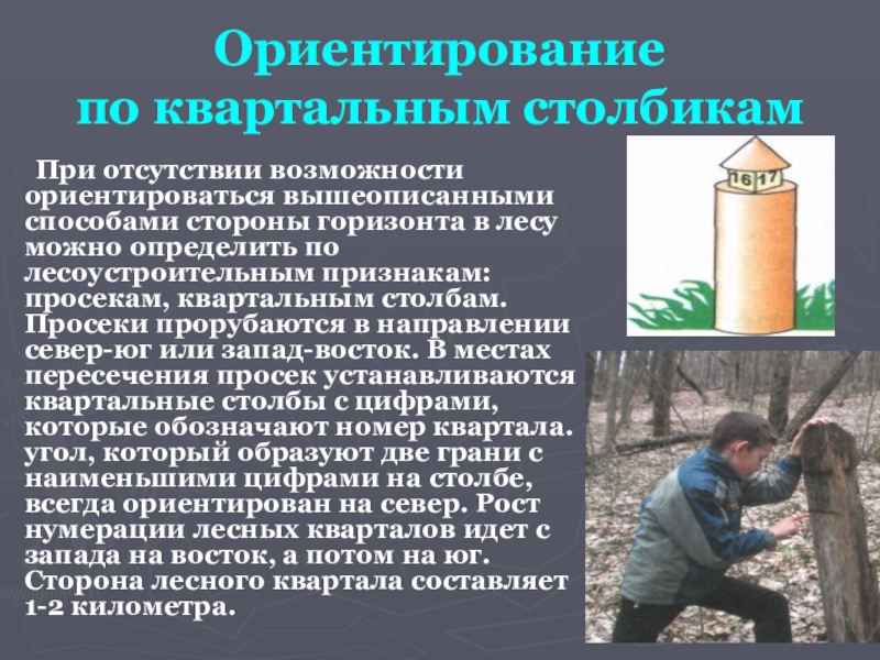 столбам. Просеки прорубаются в направлении север-юг или запад-восток. В местах пересечения просек устанавливаются квартальные столбы с цифрами, которые обозначают номер квартала. угол, который образуют две грани с наименьшими цифрами на столбе, всегда ориентирован на север. Рост нумерации лесных кварталов идет с запада на восток, а потом на юг. Сторона лесного квартала составляет 1-2 километра.