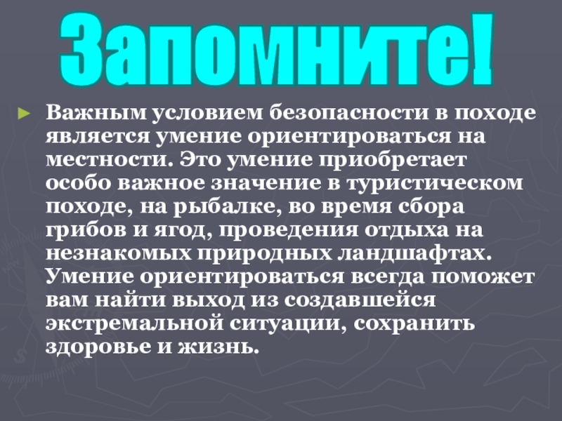Слайд 14Важным условием безопасности в походе является умение ориентироваться на местности.