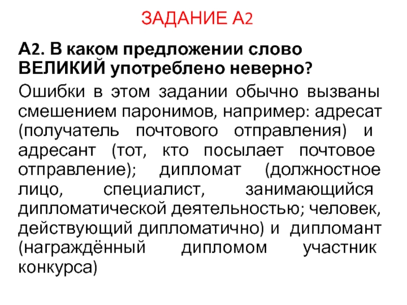 этом задании обычно вызваны смешением паронимов, например: адресат (получатель почтового