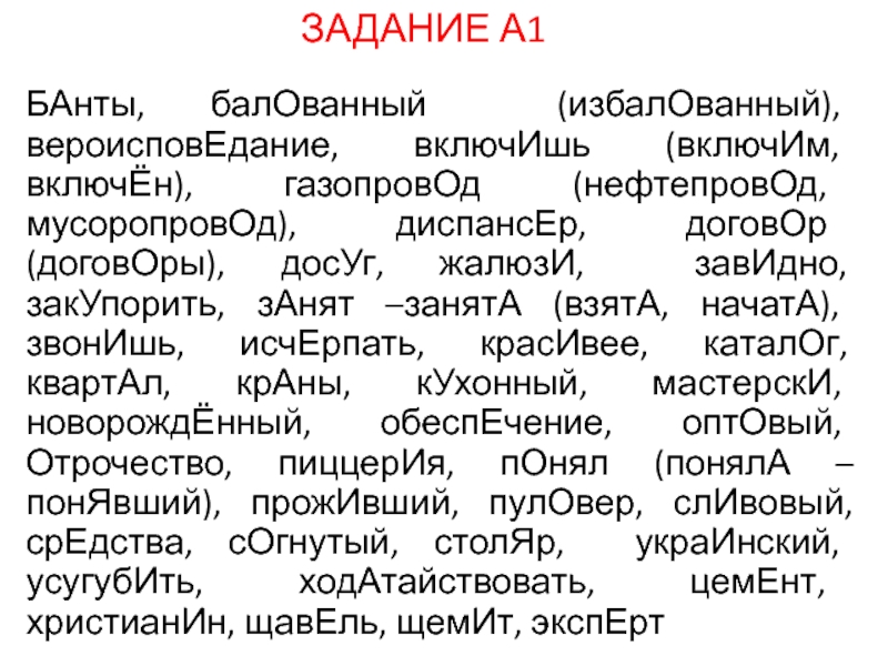 (взятА, начатА), звонИшь, исчЕрпать, красИвее, каталОг, квартАл, крАны, кУхонный, мастерскИ, новорождЁнный, обеспЕчение, оптОвый, Отрочество, пиццерИя, пОнял (понялА –понЯвший), прожИвший, пулОвер, слИвовый,срЕдства, сОгнутый, столЯр, украИнский, усугубИть, ходАтайствовать, цемЕнт, христианИн, щавЕль, щемИт, экспЕрт