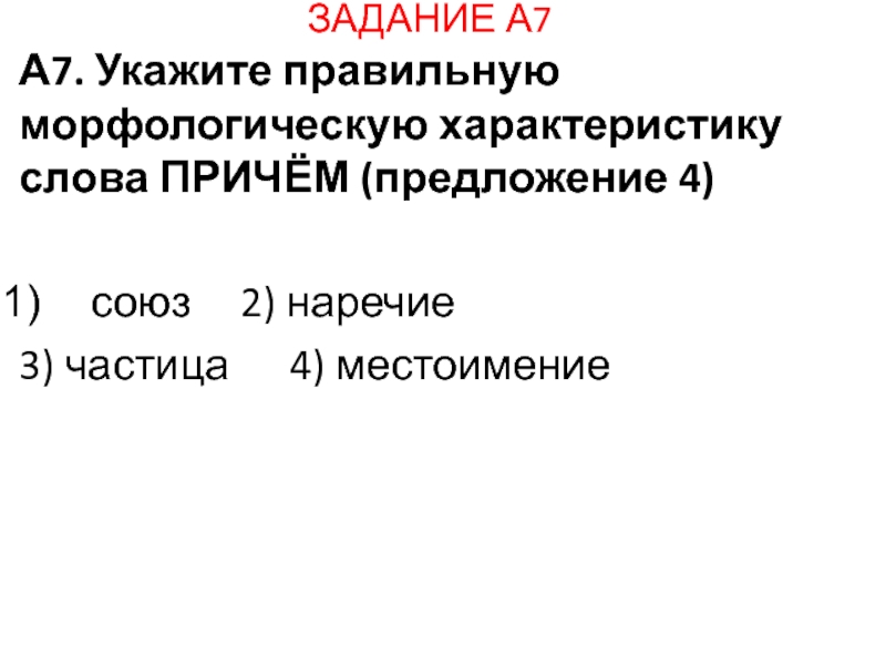 А7. Укажите правильную морфологическую характеристику слова ПРИЧЁМ (предложение 4)
