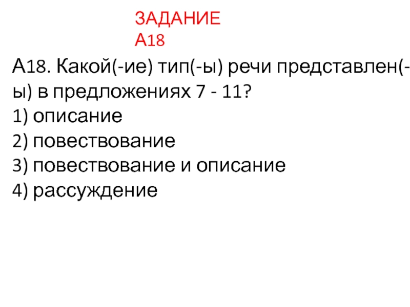 Слайд 17А18. Какой(-ие) тип(-ы) речи представлен(-ы) в предложениях 7 - 11?