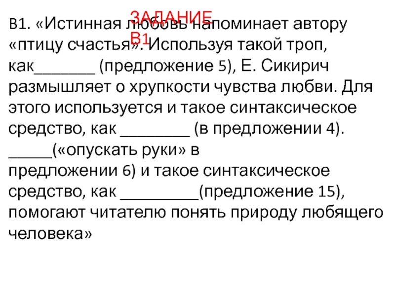 Слайд 19B1. «Истинная любовь напоминает автору «птицу счастья». Используя такой троп,