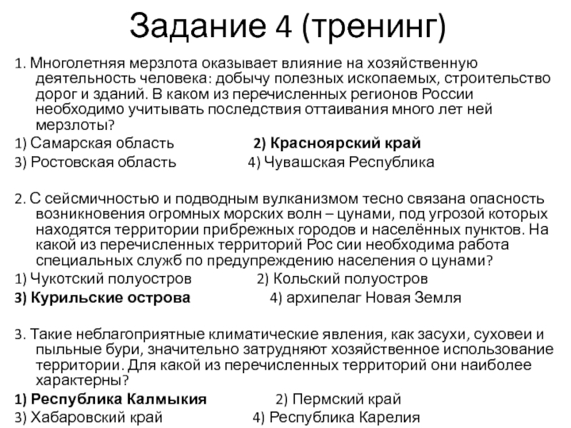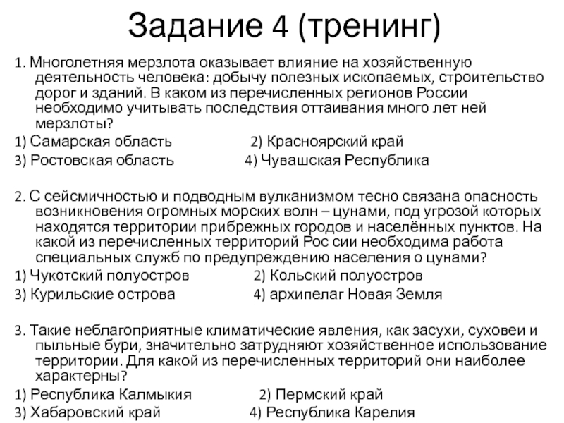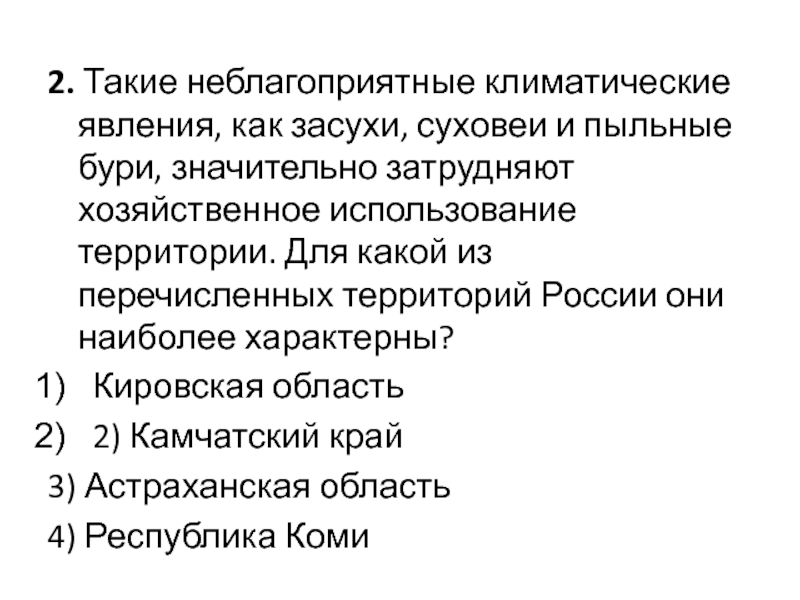 3. Такие неблагоприятные климатические явления, как засухи, суховеи и пыльные бури, значительно затрудняют хозяйственное использование территории. Для какой из перечисленных территорий они наиболее характерны?