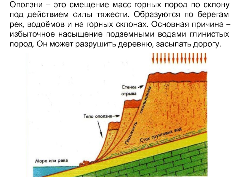 горных склонах. Основная причина – избыточное насыщение подземными водами глинистых пород. Он может разрушить деревню, засыпать дорогу.