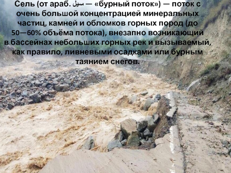 Слайд 7Сель (от араб. سيل — «бурный поток») — поток с очень большой концентрацией минеральных