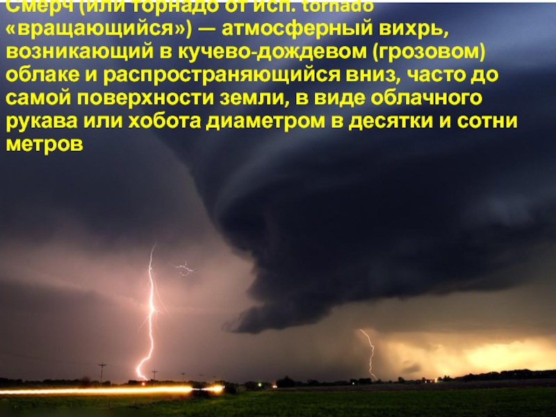Слайд 13Смерч (или торна́до от исп. tornado «вращающийся») — атмосферный вихрь, возникающий