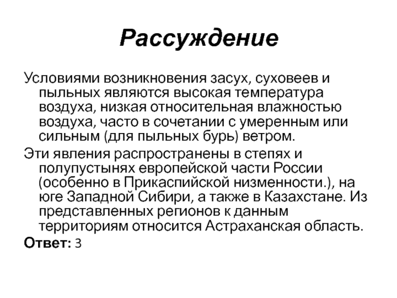 Условиями возникновения засух, суховеев и пыльных являются высокая температура воздуха,