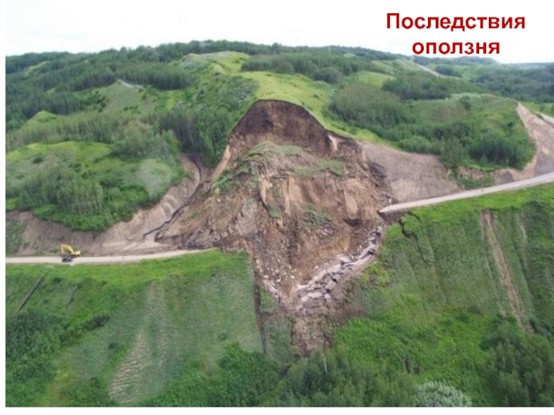 Слайд 18Оползни – это смещение масс горных пород по склону под