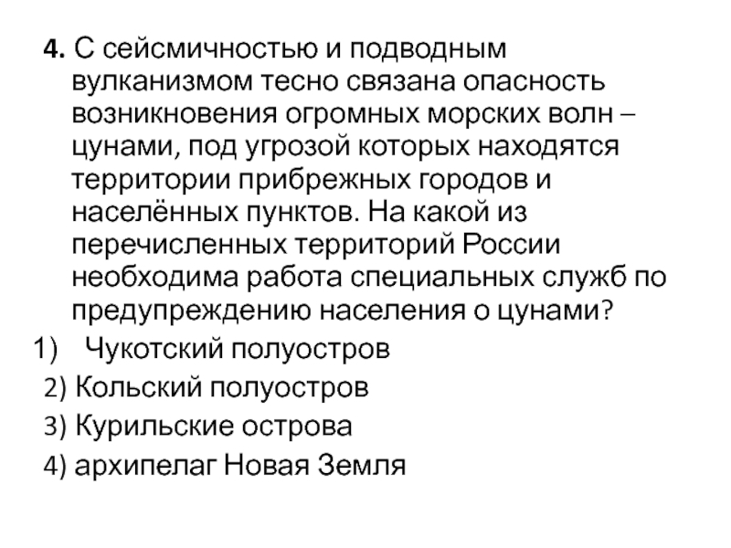 2. С сейсмичностью и подводным вулканизмом тесно связана опасность возникновения огромных морских волн – цунами, под угрозой которых находятся территории прибрежных городов и населённых пунктов. На какой из перечисленных территорий Рос сии необходима работа специальных служб по предупреждению населения о цунами?