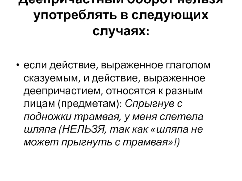 Слайд 31Деепричастный оборот нельзя употреблять в следующих случаях: