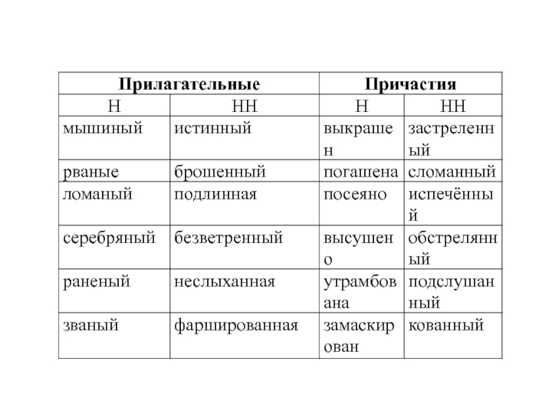 погашена, безветренный день, зерно посеяно, обстрелянный город, подслушанный разговор, бельё высушено, раненый боец, неслыханная дерзость, званый ужин, фаршированная рыба, дорога утрамбована, кованный в кузнице меч, отряд замаскирован