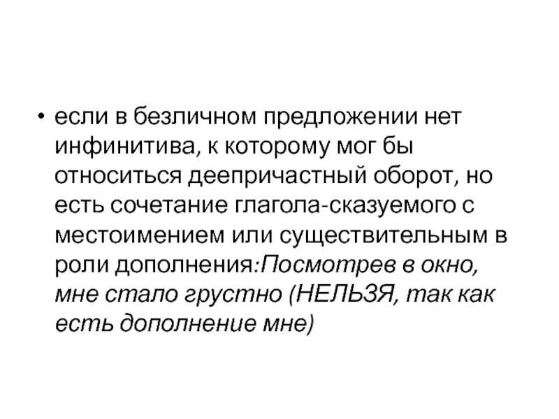 существительным в роли дополнения:Посмотрев в окно, мне стало грустно (НЕЛЬЗЯ, так как есть дополнение мне)