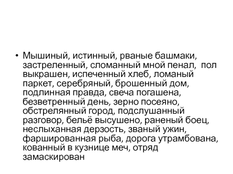 Слайд 19Мышиный, истинный, рваные башмаки, застреленный, сломанный мной пенал, пол выкрашен,