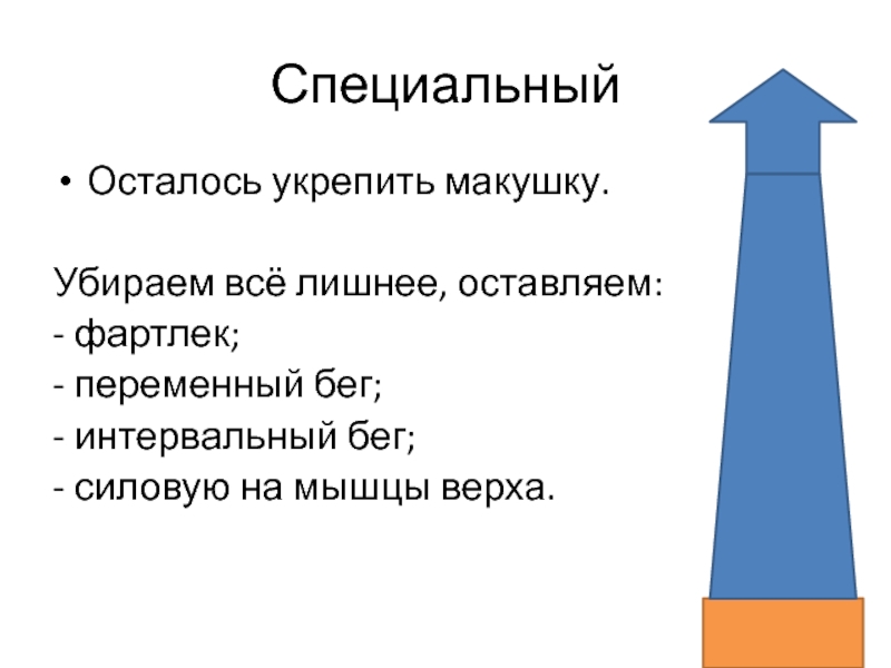 СпециальныйОсталось укрепить макушку.Убираем всё лишнее, оставляем: - фартлек;- переменный бег;- интервальный бег;- силовую на мышцы верха.