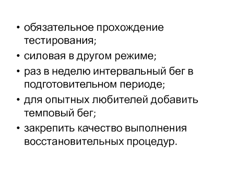 обязательное прохождение тестирования;силовая в другом режиме;раз в неделю интервальный бег в подготовительном периоде;для опытных любителей добавить темповый