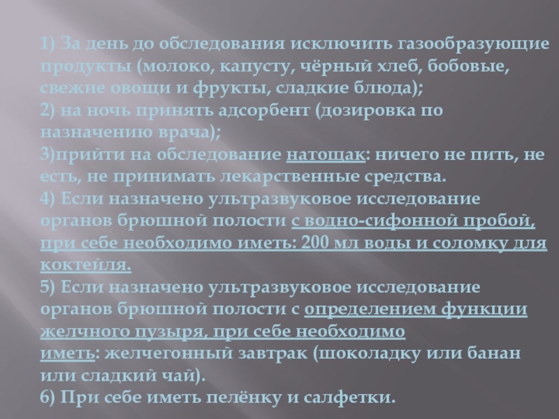 5) Если назначено ультразвуковое исследование органов брюшной полости с определением функции желчного пузыря, при себе необходимо иметь: желчегонный завтрак (шоколадку или банан или сладкий чай).