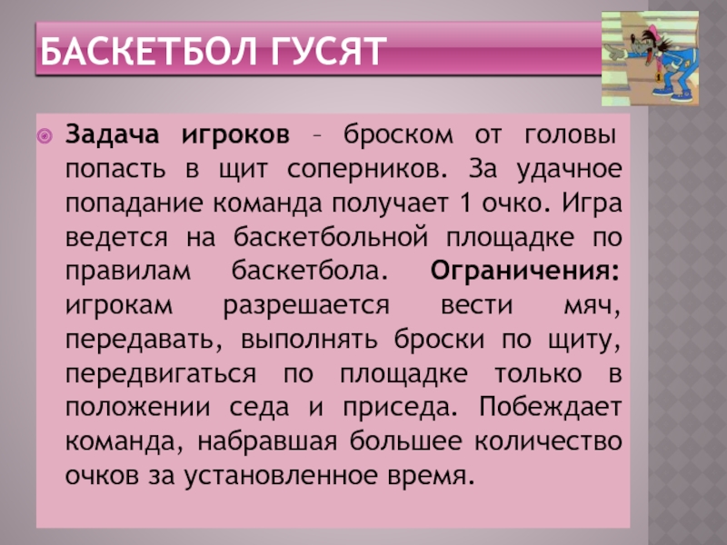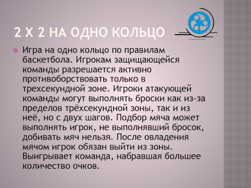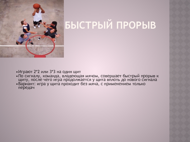трехсекундной зоне. Игроки атакующей команды могут выполнять броски как из-за пределов трёхсекундной зоны, так и из неё, но с двух шагов. Подбор мяча может выполнять игрок, не выполнявший бросок, добивать мяч нельзя. После овладения мячом игрок обязан выйти из зоны. Выигрывает команда, набравшая большее количество очков.