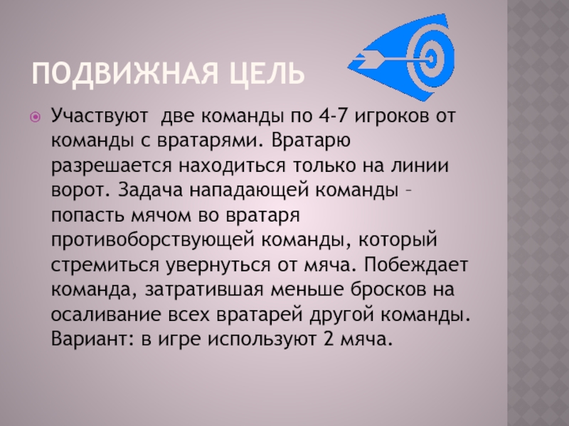 команды – попасть мячом во вратаря противоборствующей команды, который стремиться увернуться от мяча. Побеждает команда, затратившая меньше бросков на осаливание всех вратарей другой команды. Вариант: в игре используют 2 мяча.