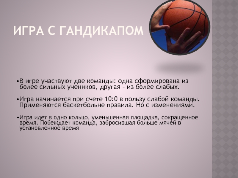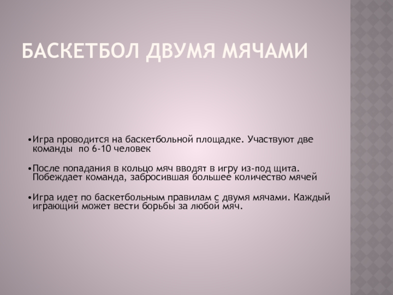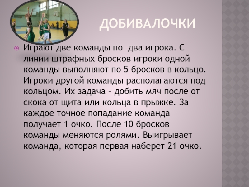 другой команды располагаются под кольцом. Их задача – добить мяч после от скока от щита или кольца в прыжке. За каждое точное попадание команда получает 1 очко. После 10 бросков команды меняются ролями. Выигрывает команда, которая первая наберет 21 очко.