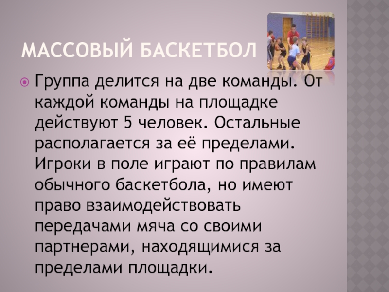 в поле играют по правилам обычного баскетбола, но имеют право взаимодействовать передачами мяча со своими партнерами, находящимися за пределами площадки.