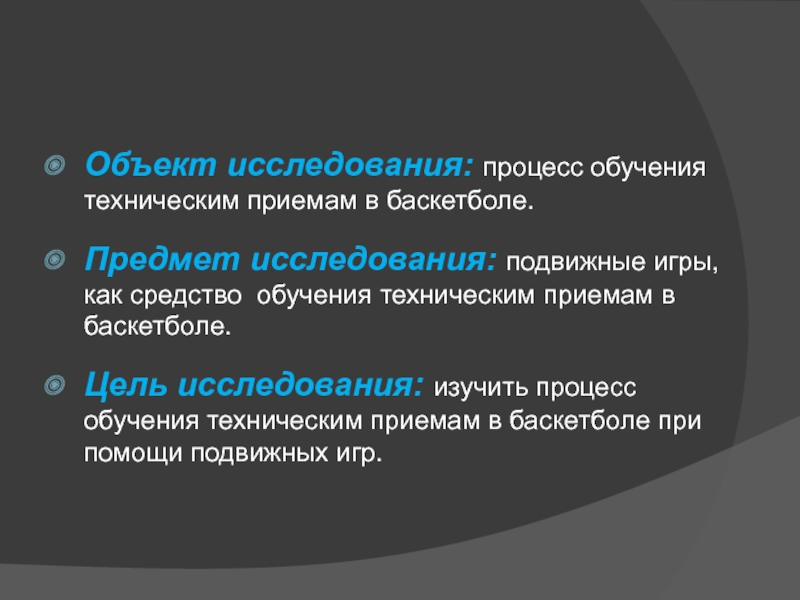 Слайд 4Объект исследования: процесс обучения техническим приемам в баскетболе.