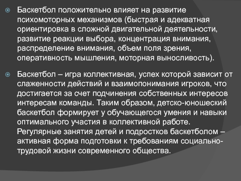 Слайд 3Баскетбол положительно влияет на развитие психомоторных механизмов (быстрая и адекватная