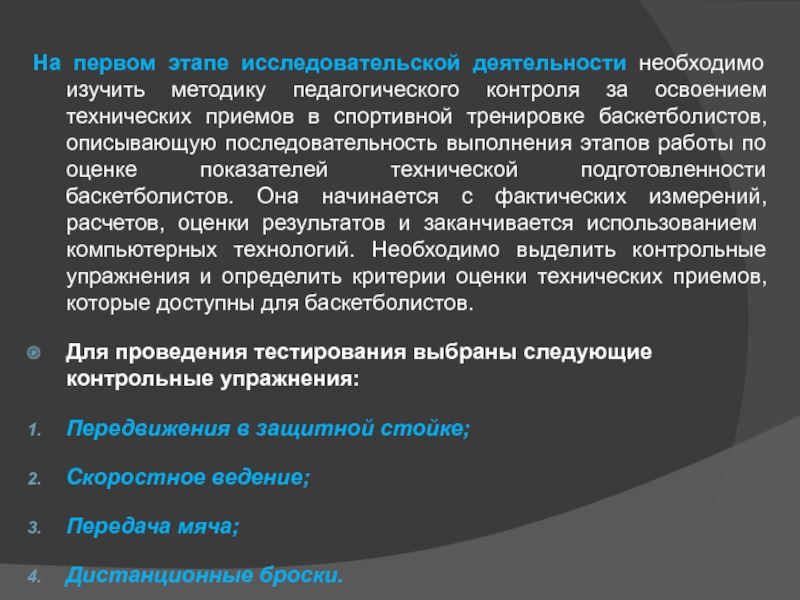 выполнения этапов работы по оценке показателей технической подготовленности баскетболистов. Она начинается с фактических измерений, расчетов, оценки результатов и заканчивается использованием компьютерных технологий. Необходимо выделить контрольные упражнения и определить критерии оценки технических приемов, которые доступны для баскетболистов.