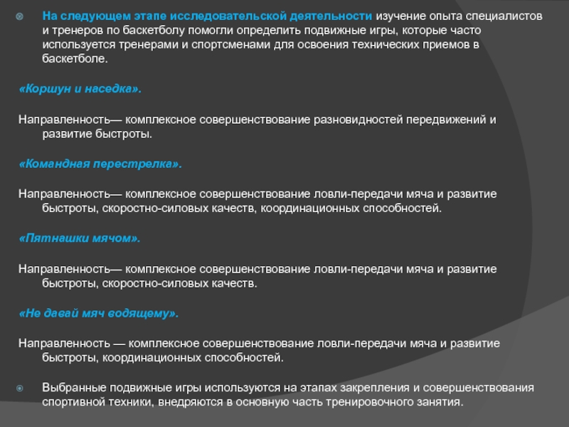 Выбранные подвижные игры используются на этапах закрепления и совершенствования спортивной техники, внедряются в основную часть тренировочного занятия.