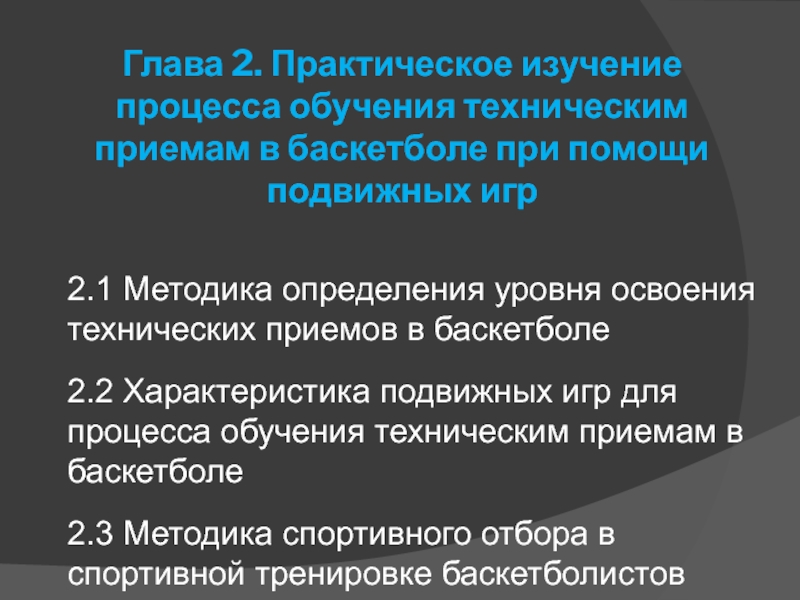 Слайд 8Глава 2. Практическое изучение процесса обучения техническим приемам в баскетболе