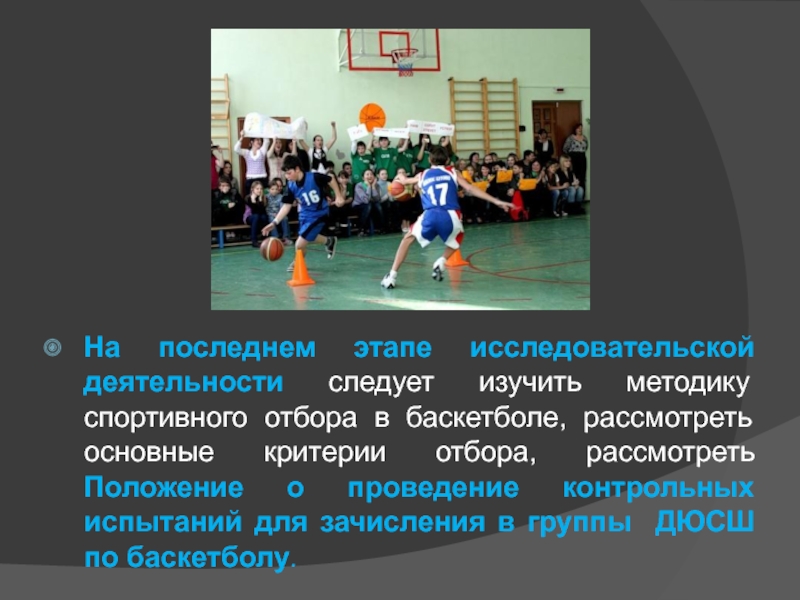 Слайд 11На последнем этапе исследовательской деятельности следует изучить методику спортивного отбора