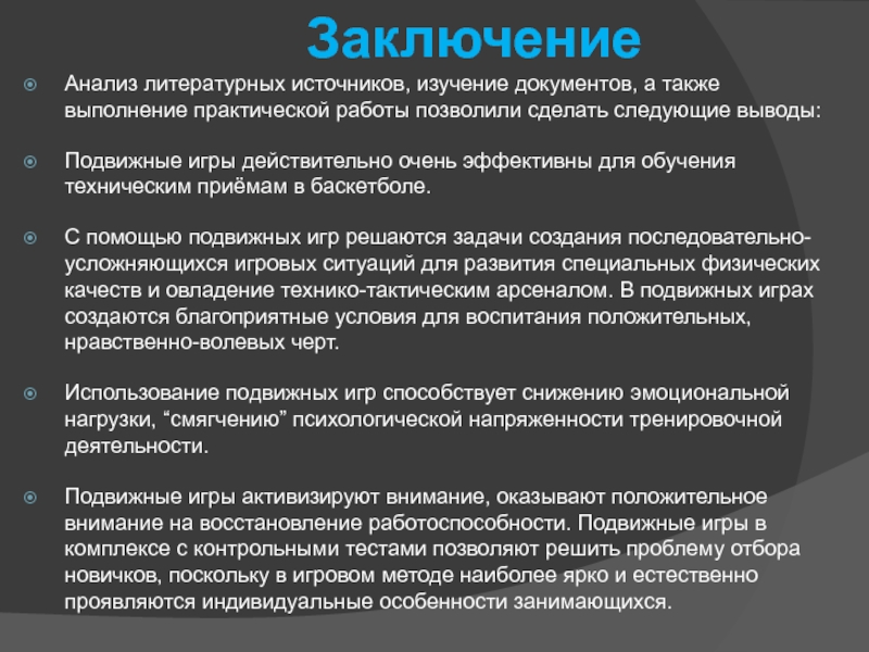 Все выше сказанное еще раз подтверждает значимость и ценность подвижных игр, как вспомогательного комплексного средства в подготовке баскетболистов, для повышения общего уровня функциональных возможностей организма, для разностороннего развития физических способностей, для пополнения фонда двигательных умений и навыков.