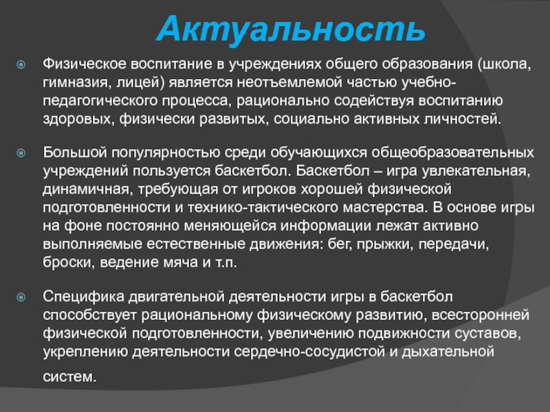 Большой популярностью среди обучающихся общеобразовательных учреждений пользуется баскетбол. Баскетбол – игра увлекательная, динамичная, требующая от игроков хорошей физической подготовленности и технико-тактического мастерства. В основе игры на фоне постоянно меняющейся информации лежат активно выполняемые естественные движения: бег, прыжки, передачи, броски, ведение мяча и т.п.