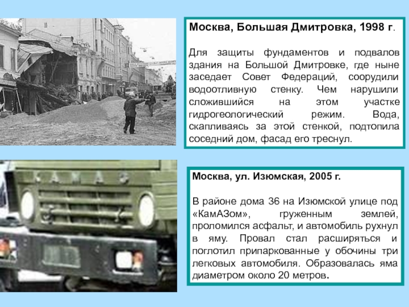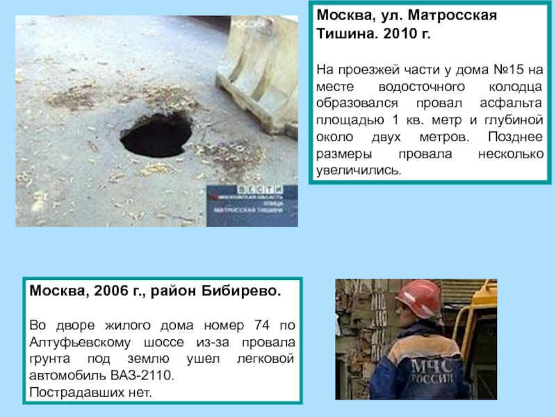 Слайд 72Москва, 2010 г. Пример карстового провала в московском районе Южное