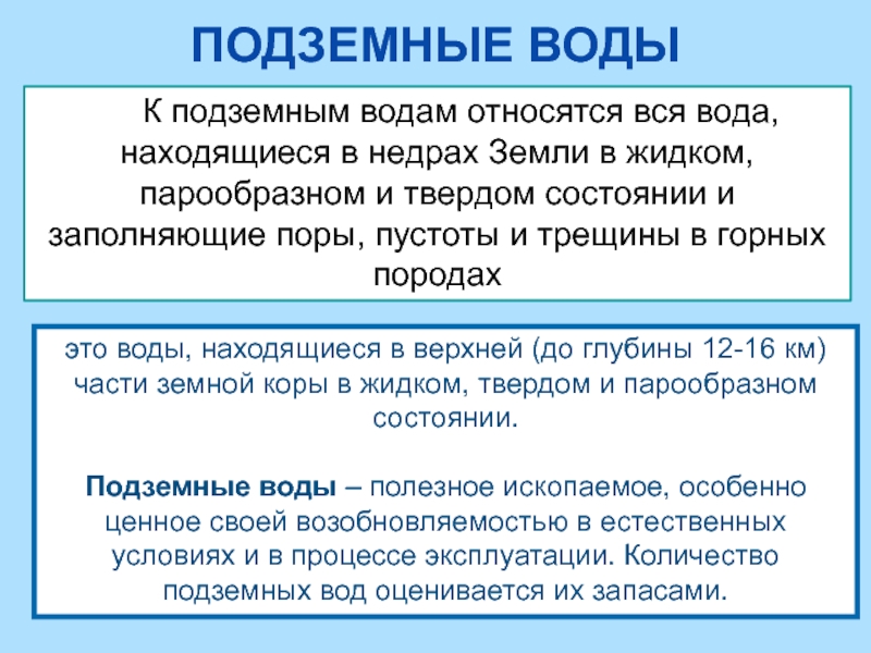 это воды, находящиеся в верхней (до глубины 12-16 км) части земной коры в жидком, твердом и парообразном состоянии.