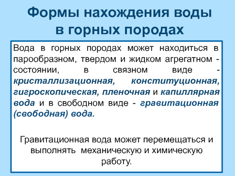 связном виде -кристаллизационная, конституционная, гигроскопическая, пленочная и капиллярная вода и в свободном виде - гравитационная (свободная) вода.