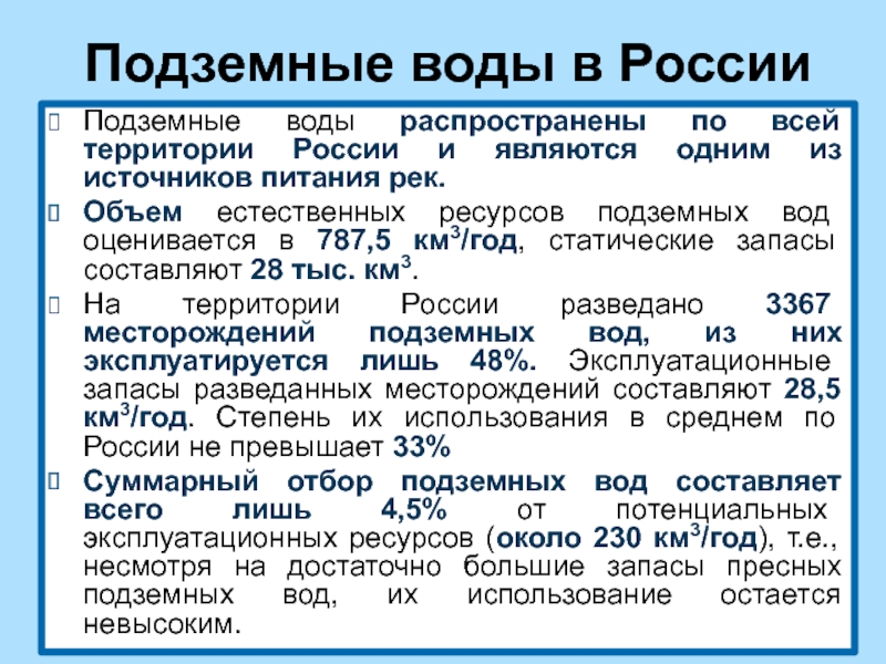На территории России разведано 3367 месторождений подземных вод, из них эксплуатируется лишь 48%. Эксплуатационные запасы разведанных месторождений составляют 28,5 км3/год. Степень их использования в среднем по России не превышает 33%