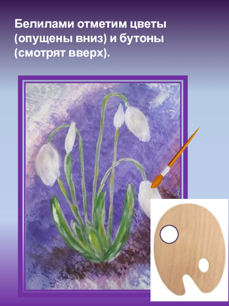 Слайд 12Белилами отметим цветы (опущены вниз) и бутоны (смотрят вверх).